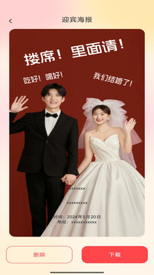 2、一键生成迎宾海报与邀请文案,风格匹配活动主题,还能加二维码,亲友扫码即可确认出席。