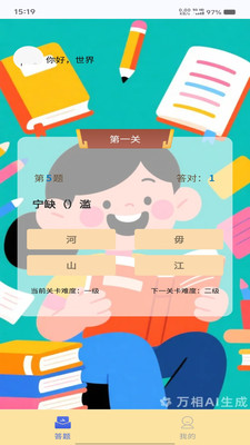智慧乐答app是一款在全国范围内广受欢迎的娱乐学习应用,它以博大精深的成语文化为深厚底蕴,匠心独运地采用了四选一猜成语的创新功能模式,在这个平台上,系统会巧妙出题,为用户精心呈现四个各具玄机的文字选项,用户则需凭借自身的成语储备与智慧,从中精准挑选出构成正确成语的字词组合,这不仅是一款能让您在欢声笑语中愉悦心情的软件,更是一个能锻炼思维、提升文化素养的神奇宝库。