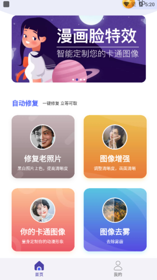 1、首页集成老照片修复、画质增强、卡通化及图像去雾核心功能。