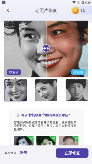 4、卡通化功能支持人像与景物转换,点击立即修复,一键生成多种艺术风格作品。