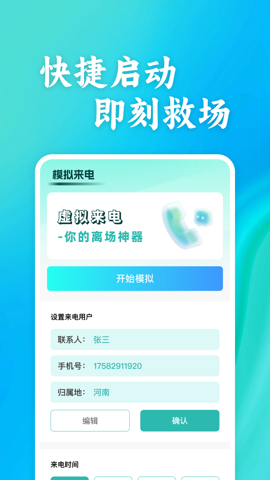 4、模拟来电趣味实用,设置模拟来电时间、联系人及通话内容,应对尴尬场合,轻松脱身。