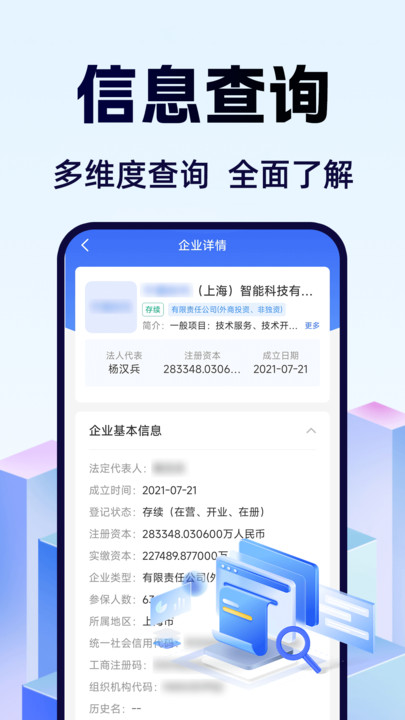 企业信息信用查查app平台的数据均来自权威数据源认证,确保每一条数据的真实性和可靠性,根据用户的搜索历史智能推荐相关企业,避免用户反复输入公司名称,提高查询效率,查询速度快,几乎秒级响应,完全不用担心等待时间过长,提供企业信用报告、企业年报查询等功能,帮助用户全面了解企业的经营状况,实时追踪市场正负面信息,帮助用户及时了解企业的舆情动态,用户可以自定义条件订阅新增企业信息,及时掌握企业动态。