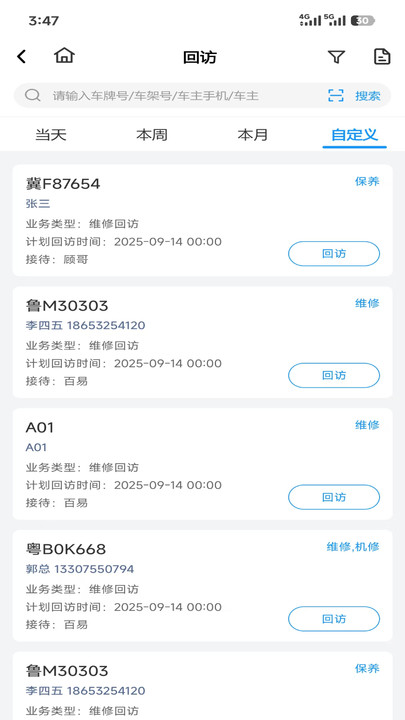 4、点击【回访】进入,根据实际情况进行回访管理。