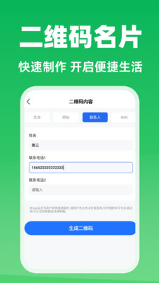 3、制作名片二维码很方便,填好姓名、电话等信息一键生成,对方扫码就能直接保存联系人。