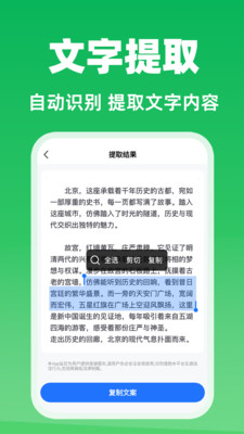 2、支持文字提取,扫图片、文档就能把文字转成可编辑格式,还能直接复制,省去手动打字的麻烦。
