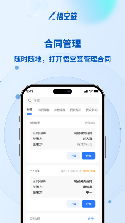 悟空签app是一款专注于提供线上电子签约服务的一站式平台,结合了现代科技手段,为用户提供多种合同签署方式、智能填写工具以及全流程的智能支持,适用于各种商务场景。通过区块链技术保障合同真实性,并采用手写签字逼真还原等创新功能,不仅帮助企业提高效率、降低成本,还让用户在个人事务中享受到更加便捷的管理体验。