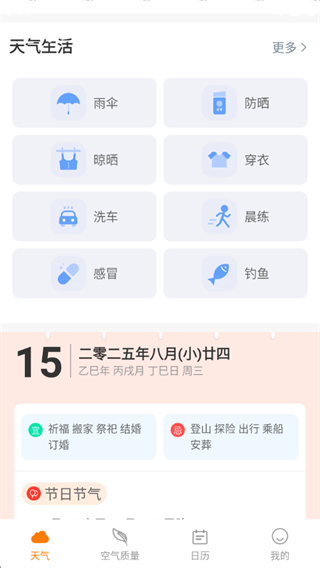 1、全场景生活指数覆盖广,除基础建议外,连钓鱼、晾晒、晨练指数都有,贴合日常各种生活需求。