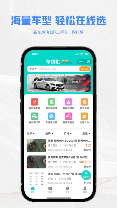 车快批app是一款让二手车查询更加高效便捷的应用软件,依靠其强大的查询功能、实时数据更新以及安全隐私保护,致力于为用户提供高效便捷的二手车信息查询体验。应用界面设计简洁,不含任何广告,用户在使用过程中能够享受流畅、无干扰的查询体验,确保专注于获取信息。不管你是商户还是买家,都可以在平台上获得优质便捷的搜索查询体验。