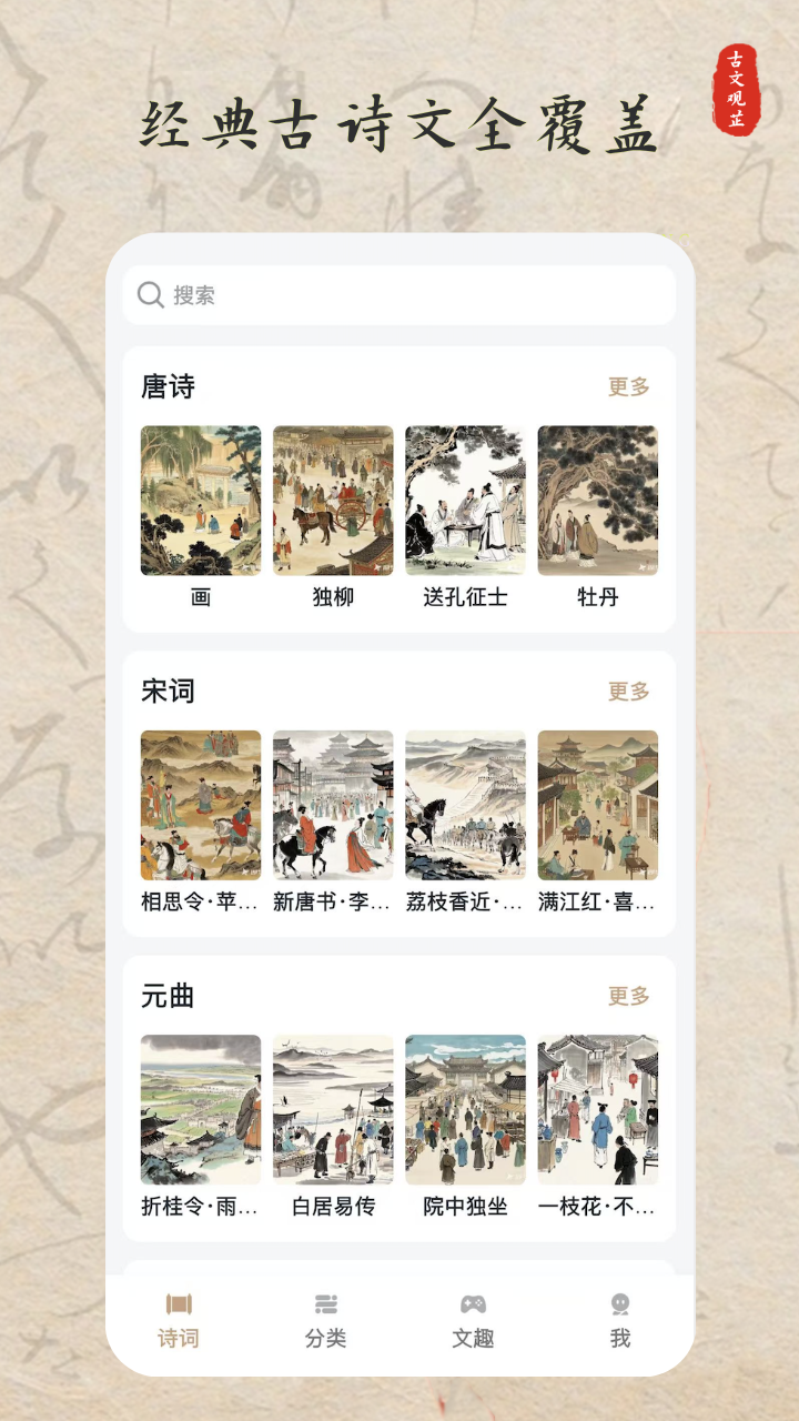 古文观芷app是全新打造的线上古诗词学习平台,涵盖的古诗词资源非常的丰富,根据不同的朝代、诗人进行了全面的划分,让你在查找的时候更加的方便,而且每一首诗词都有非常详细的解析内容为你提供,帮助你更好的去理解诗词深层含义,为了让大家可以更好的学习,还提供了很多的娱乐模式。