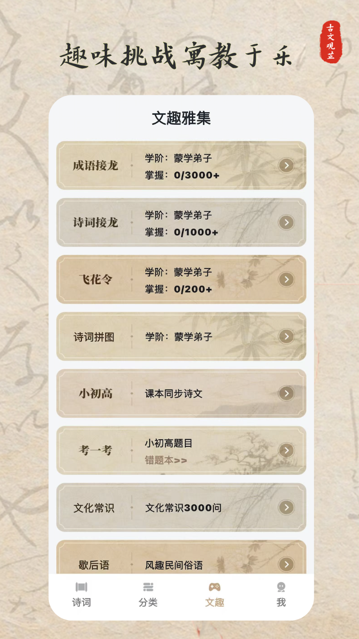 1、是我们学习古诗词非常好的选择,提供了多种不同的学习模式;
