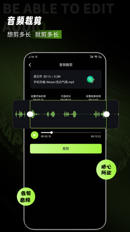 2、可精准裁剪音频,通过拖动时间轴标记裁剪起点与终点,去除冗余部分。