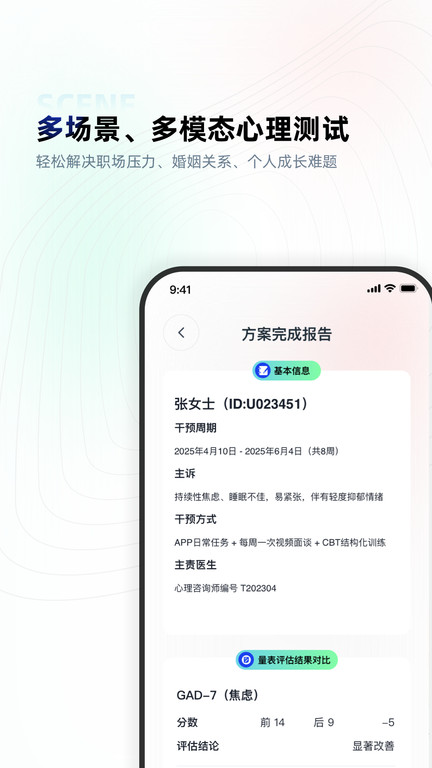 3、精准筛查与测试,提供标准化的心理测评工具,帮助用户快速了解自身心理健康状况。