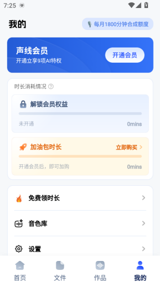 4、我的页面,在个人中心页,有会员权益需解锁,还有音色库服务。