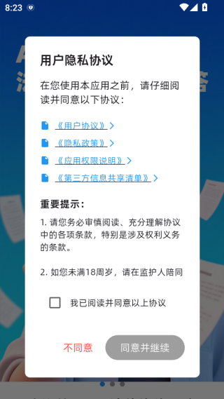 1、打开安装完成的APP,进入隐私协议页,勾选后点击同意并继续。