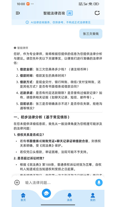 法律智能王APP是一款智能法律咨询问答服务平台,配备了智能问答系统,可以通过简单的提问获取即时的法律建议和指导,这种模式大大提高了法律咨询的效率,帮助用户迅速找到问题的解决方案。APP内置全面的在线法律咨询功能,用户可以根据不同法律领域,如合同法、婚姻法、劳动法等,选择相应的咨询模块,快速定位法律问题并获得专业解答。