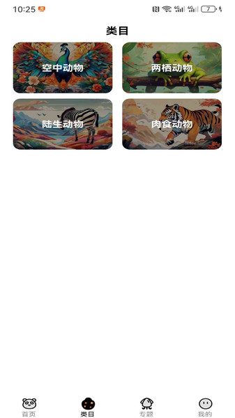 3、来到软件类目页面可查看空中动物、两栖动物、陆生动物、肉食动物等内容。