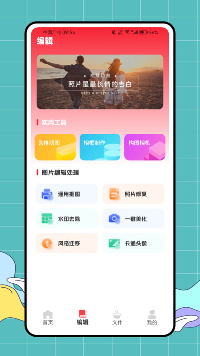 3、在编辑页面,提供宫格切图、相框制作、构图相机等版块,还有多种图片编辑处理功能。
