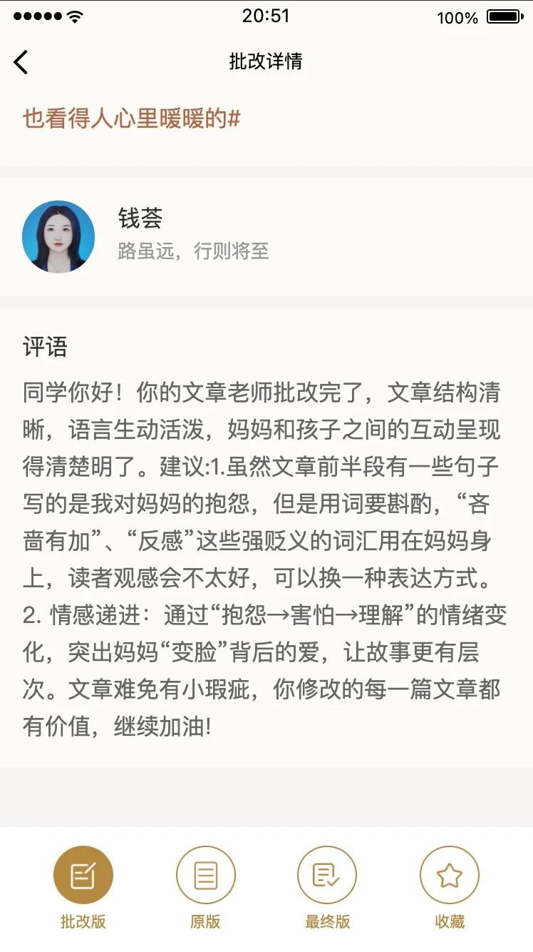 51改作文app提供海量优秀作文范文,按评分等级、题材或考试类型分类,学生可以学习优秀范文的写作技巧,精准点评作文中的语法错误、逻辑漏洞等,细致到每一处标点,让学生清楚了解优缺点,提供实时作文批改服务,用户提交作文后可快速得到专业反馈,节省时间,提升效率,教师可以一键发布作业,并获取写作结果数据分析,减轻作文批改负担,建议学生修改的地方附有范例解说,帮助学生理解并对自己的作文进行修改提升。