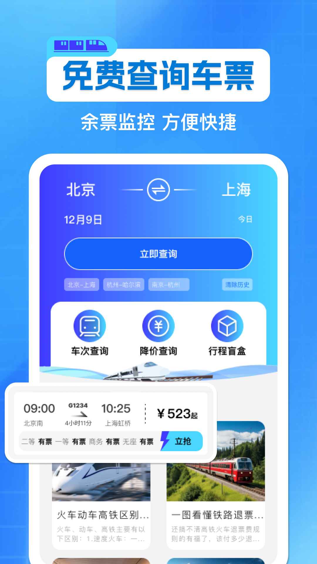 铁路火车票抢票查app是一款一站式出行智慧管家,让你重新定义购票新体验,app以智能抢票+趣味出行为核心,集车次查询、票价监控、盲盒旅行、知识科普于一体,为旅客打造从购票到出行的全流程智慧服务,无论是日常通勤还是假日远游,都能通过精准算法与趣味设计,让每一次旅程充满惊喜与效率。