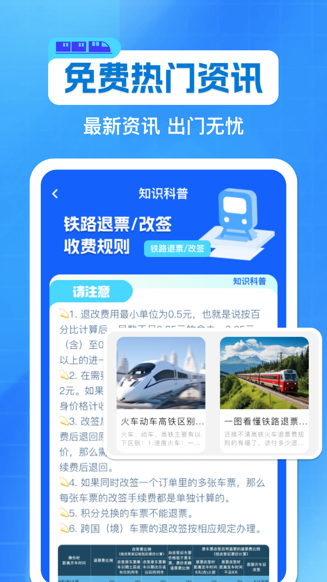 1、内置铁路百科,从车票类型、座位等级到退改签规则,图文详解助你秒变铁路达人。