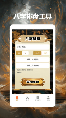 2、打开app,简单输入生辰信息,瞬间获得专业八字排盘,洞悉人生轨迹。