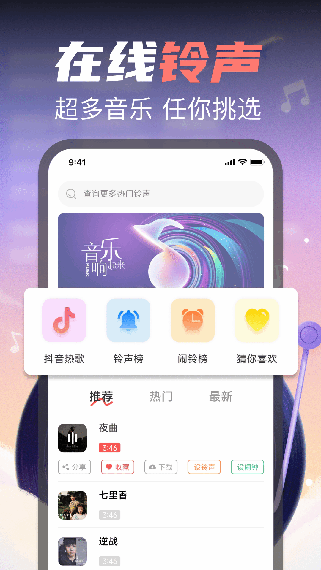 1、内置零门槛的铃声制作工作室,只需选择心仪歌曲并标记起止时间,三步骤即可生成专属手机铃声。