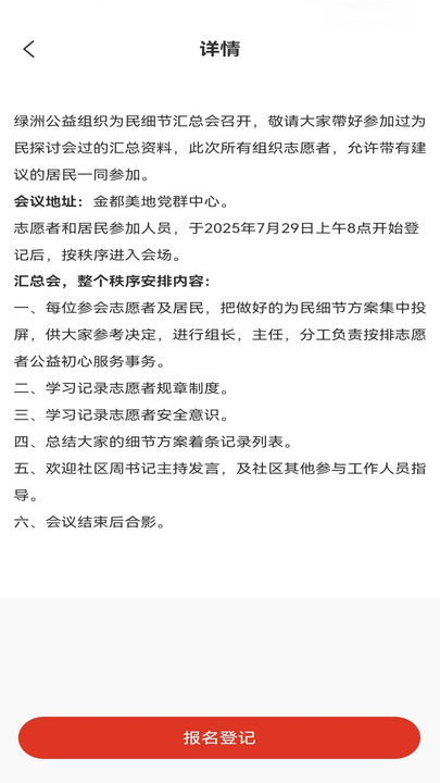 3、点击感兴趣的公益活动进入,可以看到详细的活动详情信息并且报名登记。