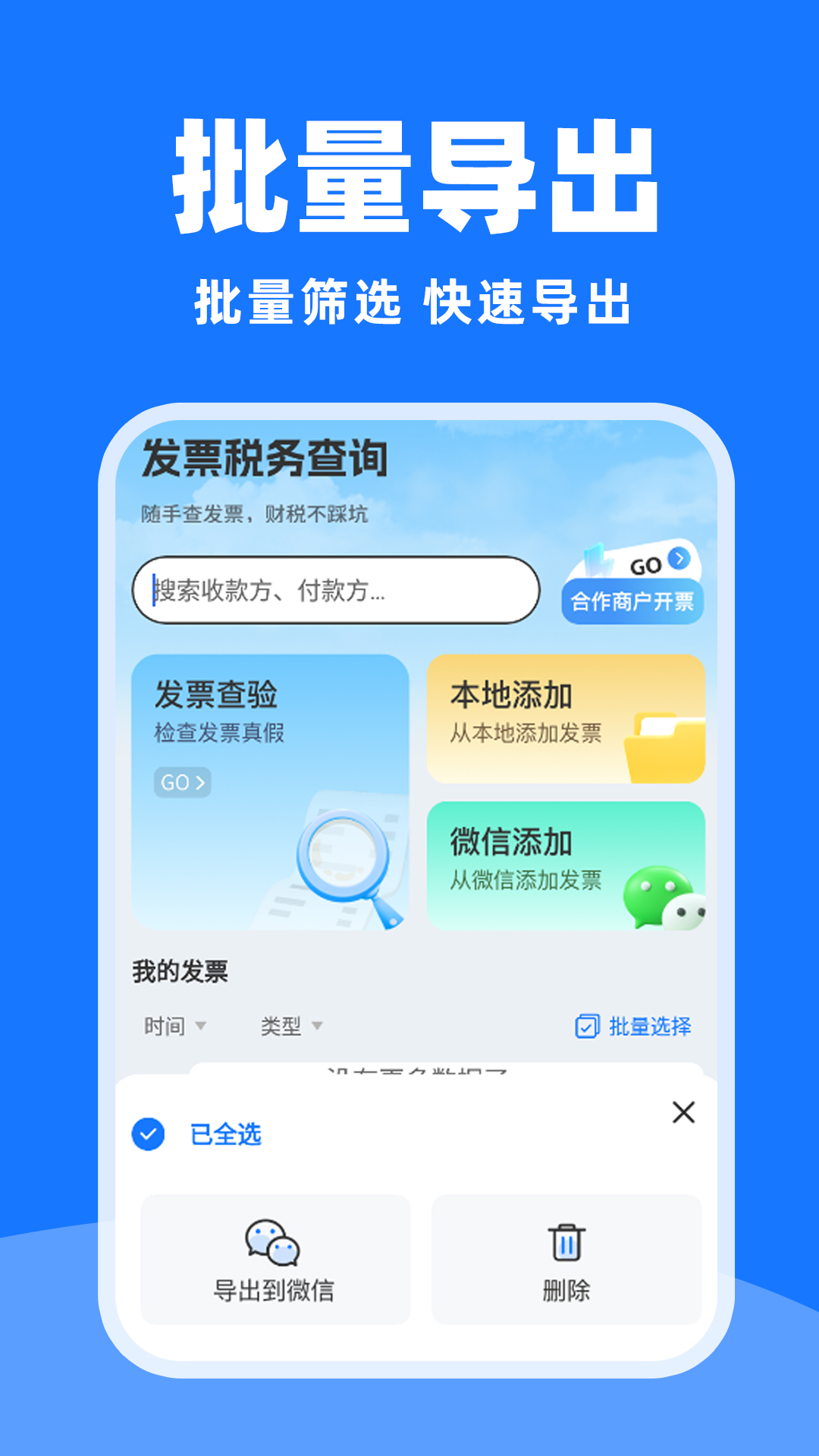 2、云端备份,发票数据自动同步至云端,即使更换设备也能轻松恢复,确保数据不丢失。