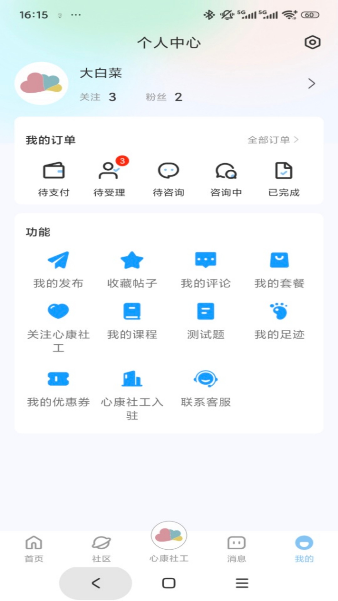 心康社工app能够为人们提供专业的心理健康服务,提供专业心理咨询服务,不管是线上还是线下都可以通过平台获取专业的心理支持。平台上包含了很多心理健康相关的内容,提供心理测评,让用户更了解自己的内心,也可以通过测评来干预心理健康问题,提升大家的心理素养。涵盖不同方面的心理咨询服务,支持一对一咨询,帮助大家解决心理问题。