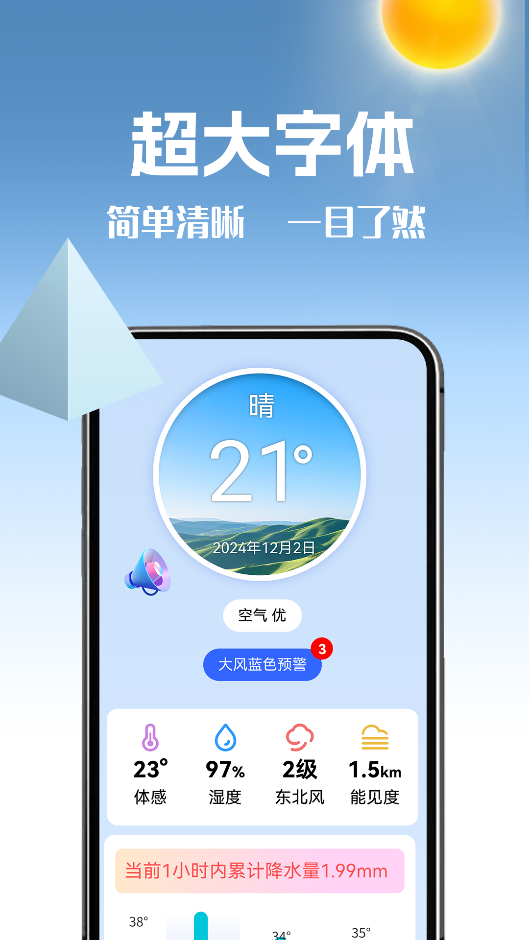 3、打开app超大字体设计,清晰展示每日天气概览,无论是温度、湿度还是风力,一切数据尽收眼底,无需费力辨认。