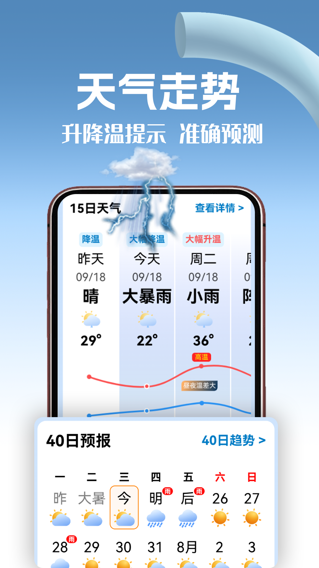 1、提供长达40日的天气预报服务,让您对未来一个多月的天气走势了如指掌,提前规划,从容不迫。