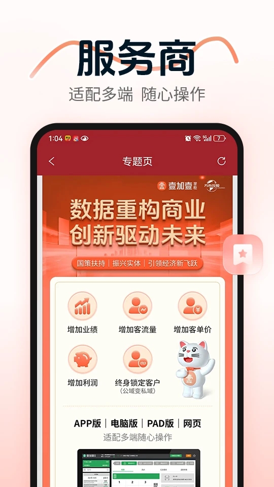 3、提供了一个高效便捷安全的办公管理体验,帮助服务商更好地管理商户资源,提升业务效率和质量。