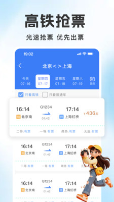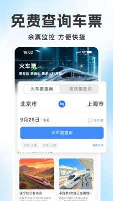 铁路火车订票查app是一款一站式智慧出行好帮手,聚焦铁路出行需求而设计的全能型实用工具,整合全国火车、高铁班次信息,实时更新票价与余票数据,为用户提供从查询到订票的一站式服务。无论是短途通勤还是长途旅行,只需轻点屏幕,即可轻松掌握行程动态,让每一次出行都高效有序。