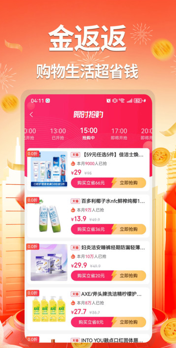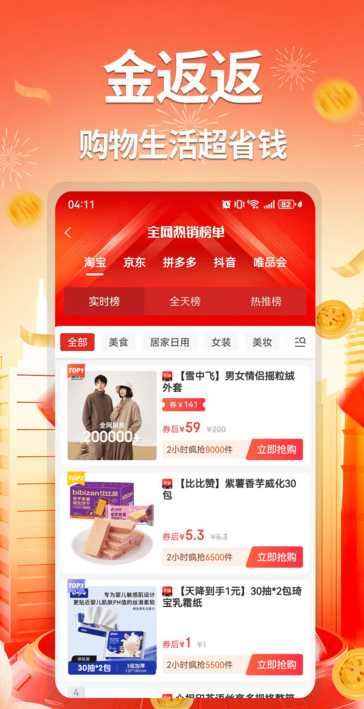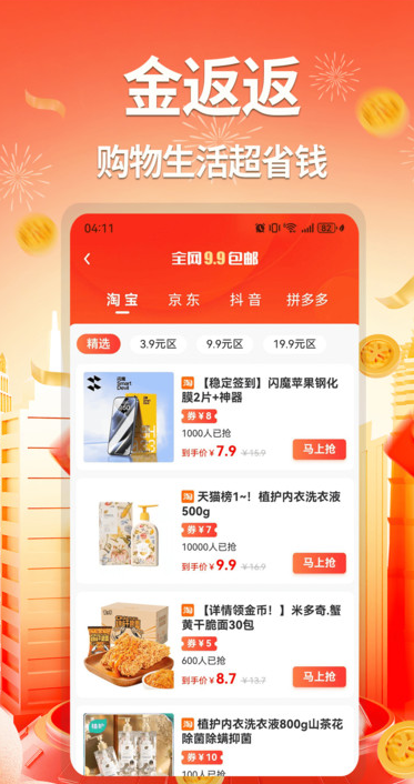 金返返app是一款很不错的省钱购物返利软件,每天都会有大量的好物将会随时上线,喜欢购物的用户可以更轻松更快速来这找到需要的商品,线上购买也是比较简单,只需要输入你需要的商品关键字即可,系统快速为你匹配,你也可以快速来这进行挑选,不同的商品可以满足不同的用户购买需求,低价即可在线抢购下单。
