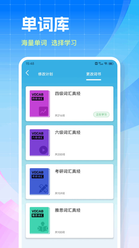 2、在背词设置中,进行词书切换,,支持自定义词库创建。
