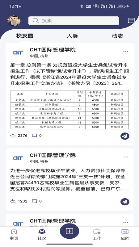 2、打开社区页面,体验校友圈、人脉和动态三个版块,实时互动。