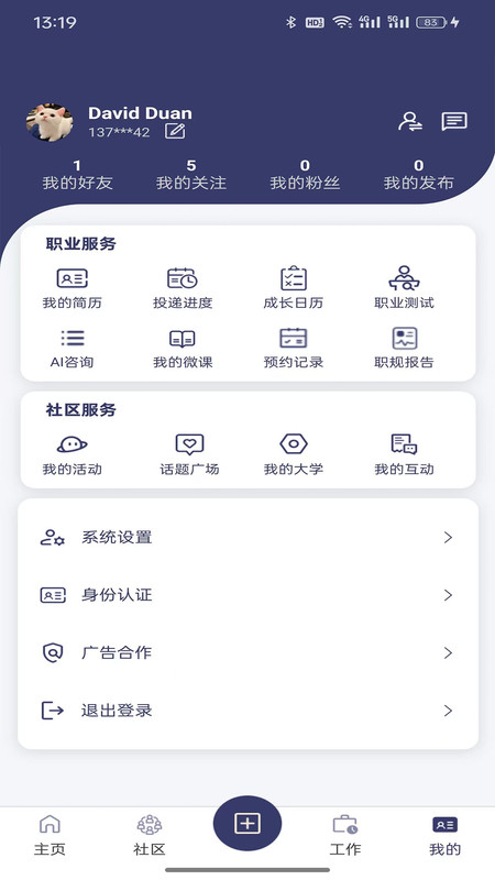 4、在“我的”页面,进行登录或注册,查看职业服务和社区服务等内容。