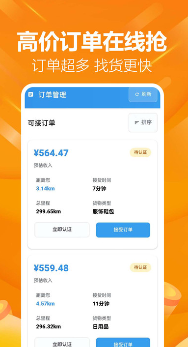 3、订单卡片清晰标注核心信息:货物名称、装货地址与卸货地址、订单金额及发货方联系方式。