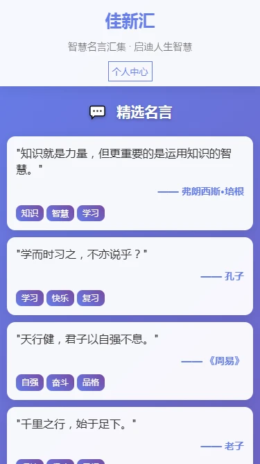 佳新汇app是一款汇聚古今中外智慧精髓的宝藏应用,如同一位博学多才的智者,将无数名言警句精心整理,为用户点亮人生的智慧灯塔,通过app,用户不仅能接触到跨越时空的深刻思想,还能在有趣的智慧问答互动中,加深对名言内涵的理解,启迪思维,收获宝贵的处世哲学,让每一次探索都成为一次心灵的洗礼。