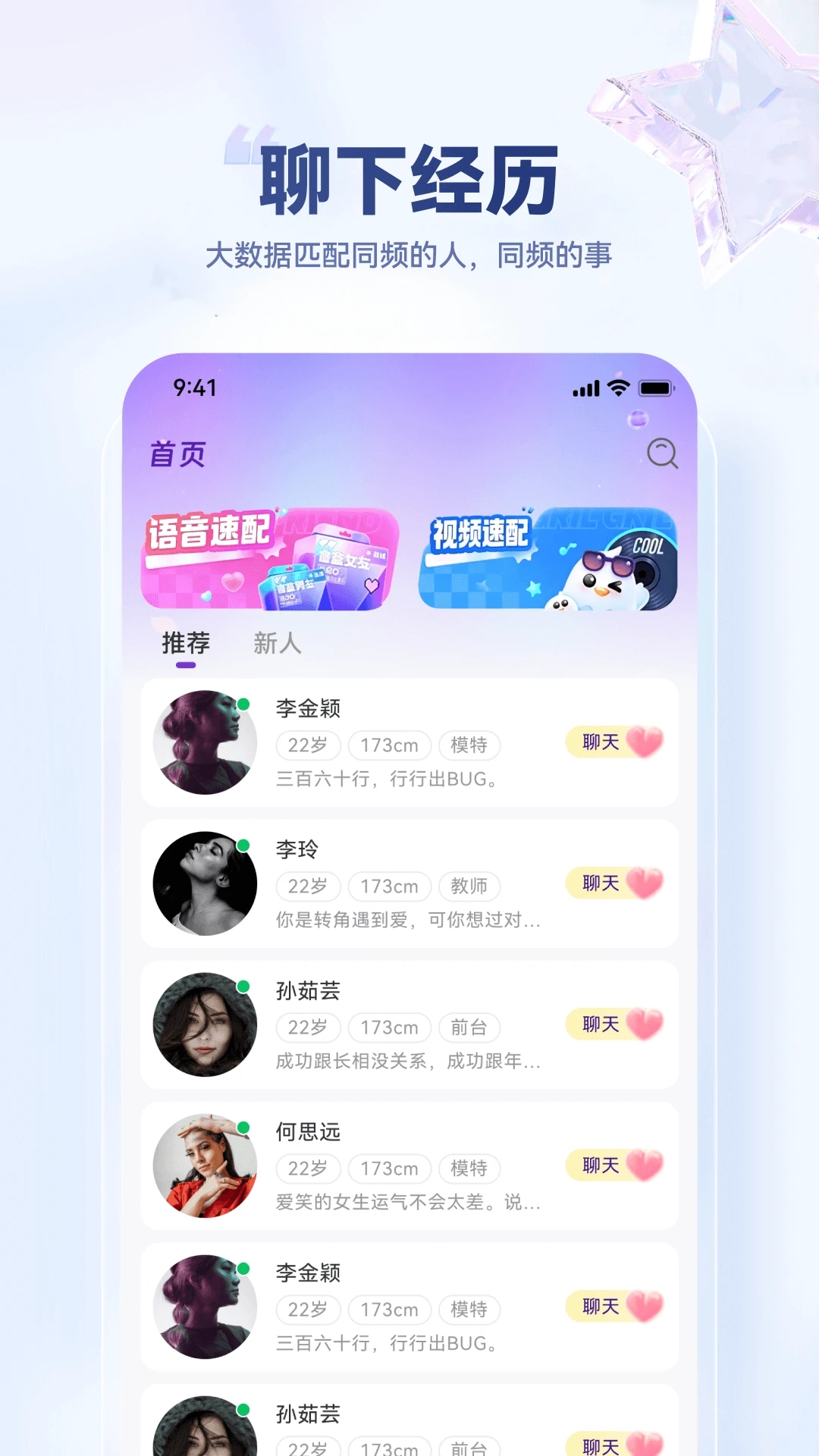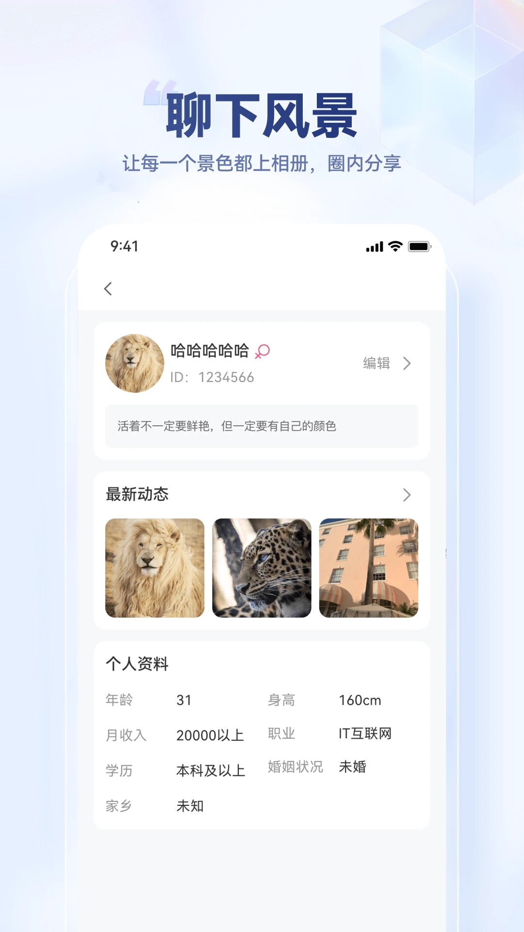聊下app后台人工审核用户信息,杜绝虚假信息和不良用户,通过大数据分析,精准匹配符合用户要求的对象,提供快速匹配功能,用户可快速找到心仪对象,利用定位功能,推荐附近单身用户,增加脱单机会,简单便捷的操作流程,让用户轻松上手,设置约会、交友、职场等多种模式,满足不同场景需求,用户可像在微信朋友圈一样发布动态,展示生活,增加互动,开展丰富多彩的主题活动,提升用户社交经验和能力。