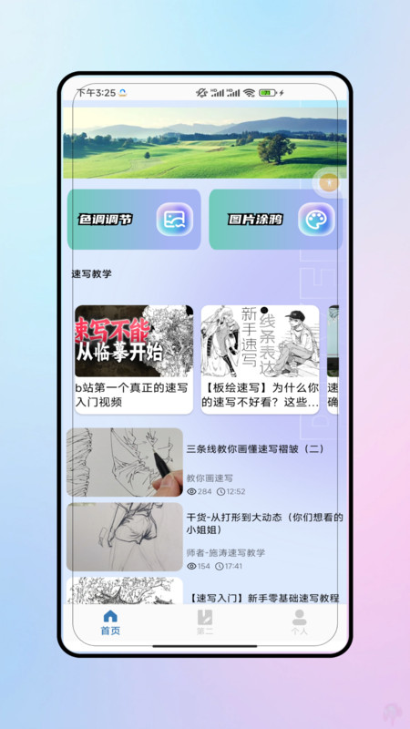 1、在首页中提供了色调调节、图片涂鸦的版块,还有精彩的速写教学。