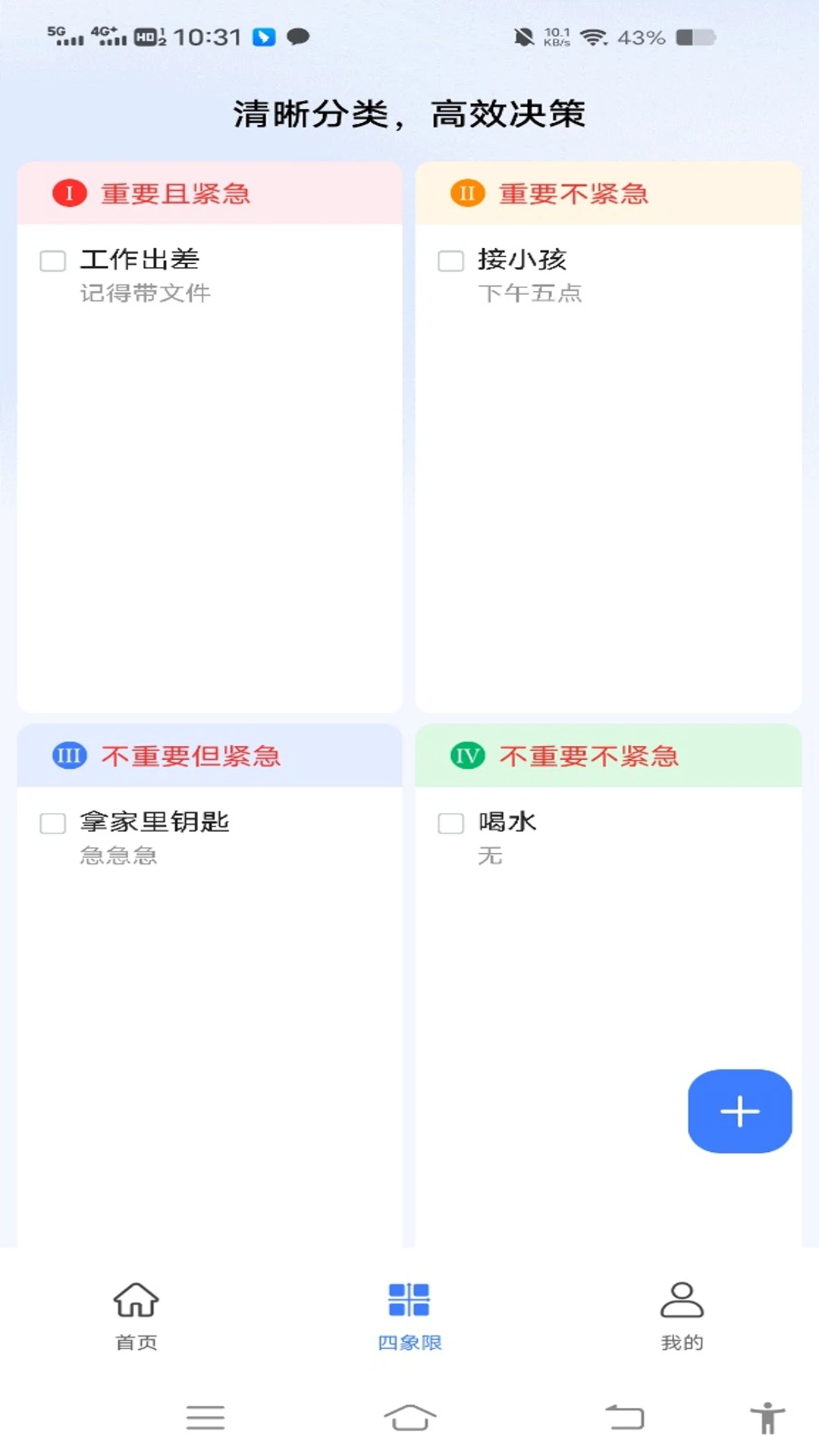 4、点击【四象限】进入,根据事件的重要程度进行分类。