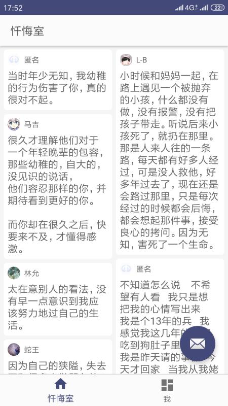 1、进入首页,可以了解各类匿名的忏悔信息,可以随时进行查看各类信息。