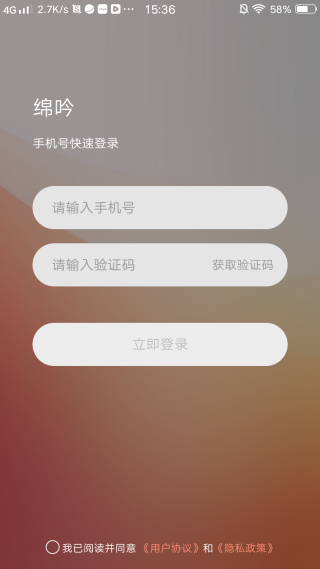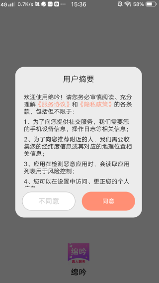 1、在手机上轻松下载安装绵吟app,仔细查看用户摘要内容后点击同意。