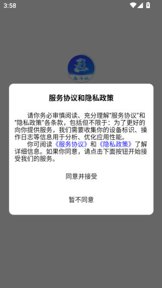 1、打开已经安装完成的app,在弹框页面点击同意并接受。