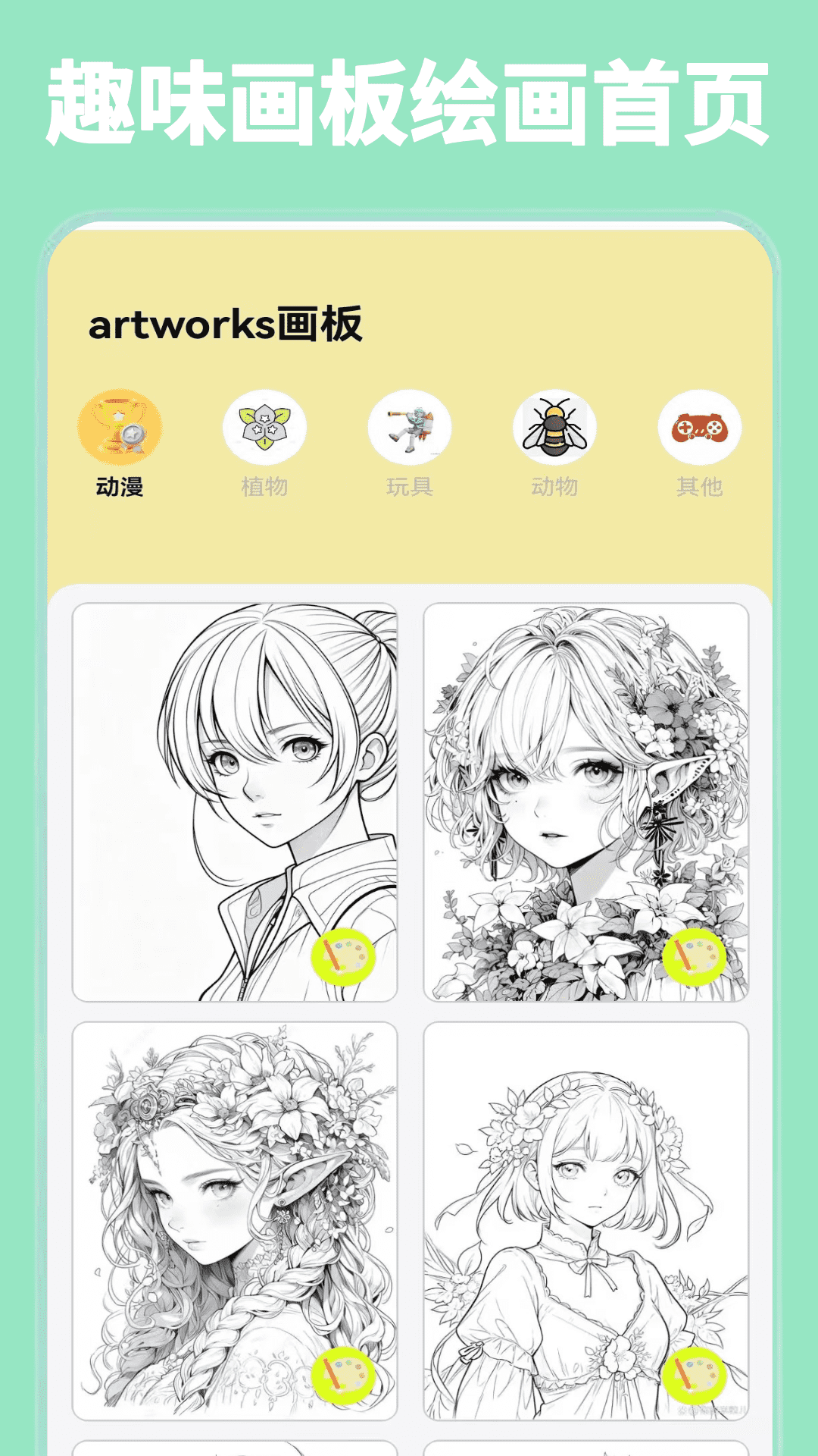 3、通过详尽的绘画分类,无论是动漫角色、自然风光,还是生活小物,皆能迅速定位心仪主题,开启专属创作。