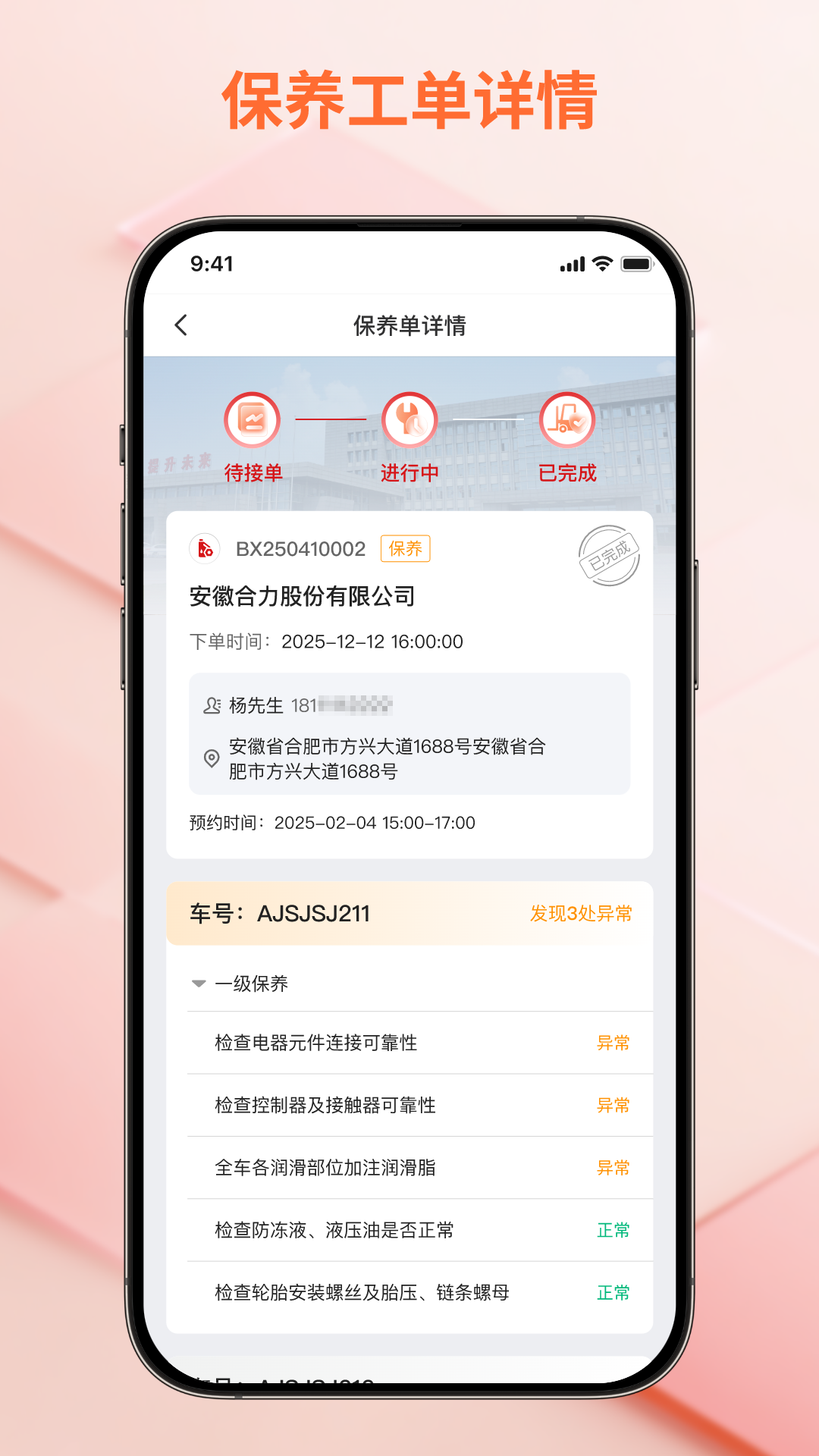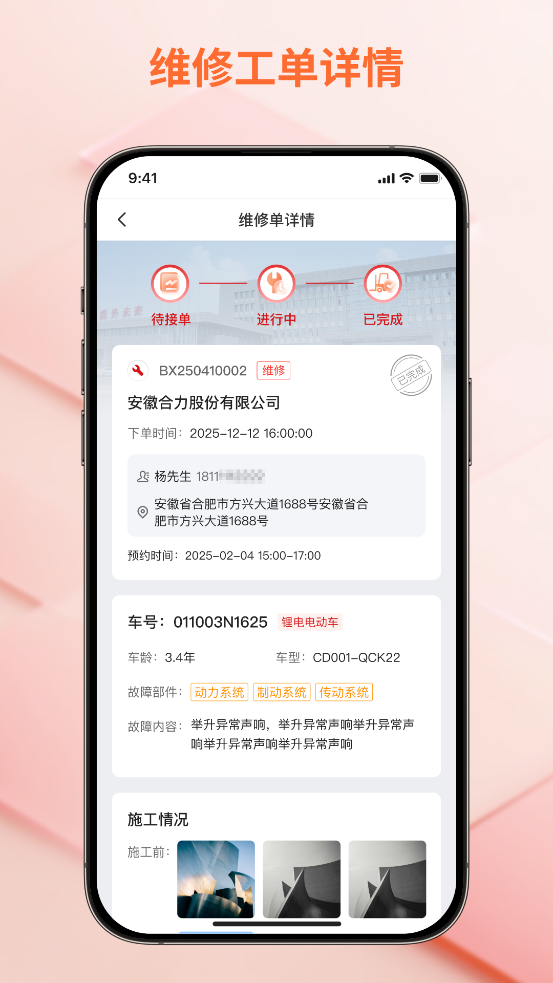 4、打开app展示待处理维修工单与已完成工单概览,维修任务一目了然,便于快速响应与分配。