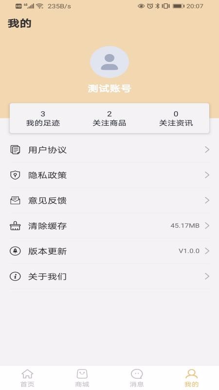 4、来到软件我的页面可使用用户协议、隐私政策、意见反馈、清除缓存等功能。