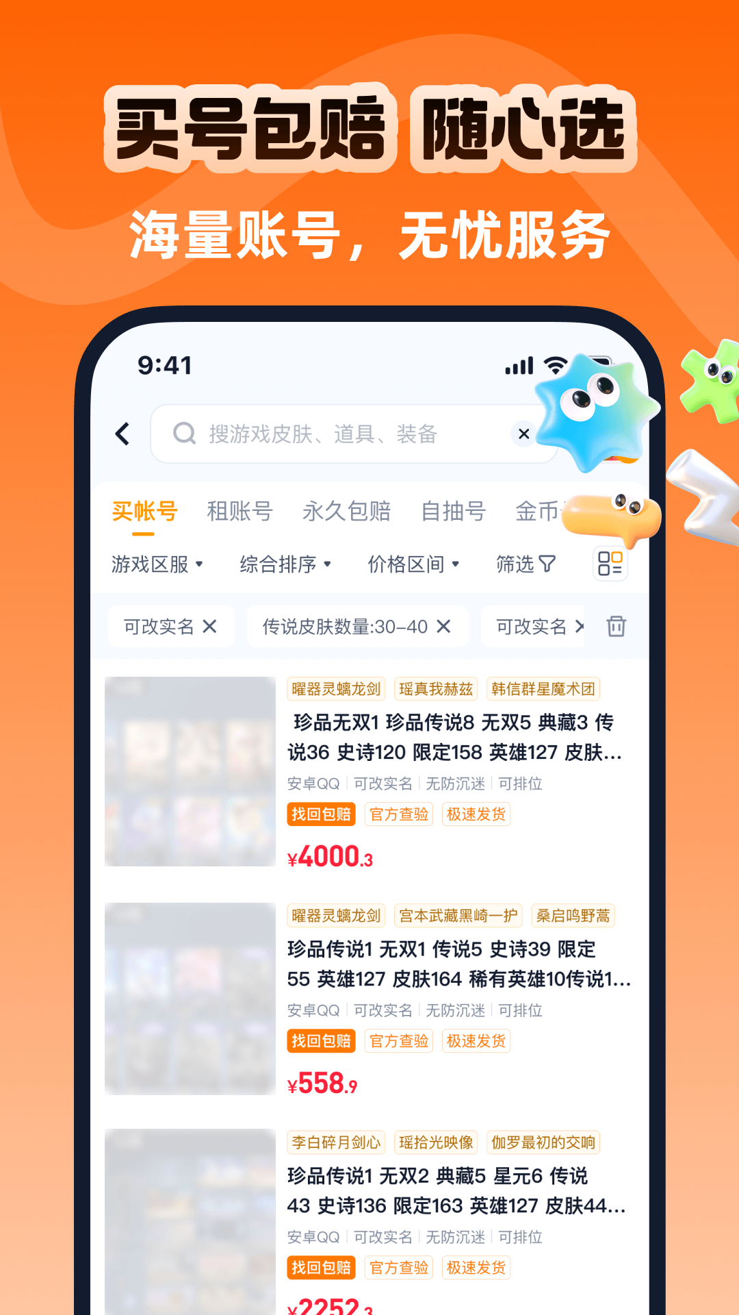 3、覆盖王者、原神、LOL、DNF、吃鸡等 2000 + 款游戏,高段位、绝版皮肤、满命角色号实时更新,日均上新 3000 笔,挑号不用等。