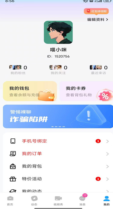 3、用户进入了首页,即可领取平台为你提供的交友红包。